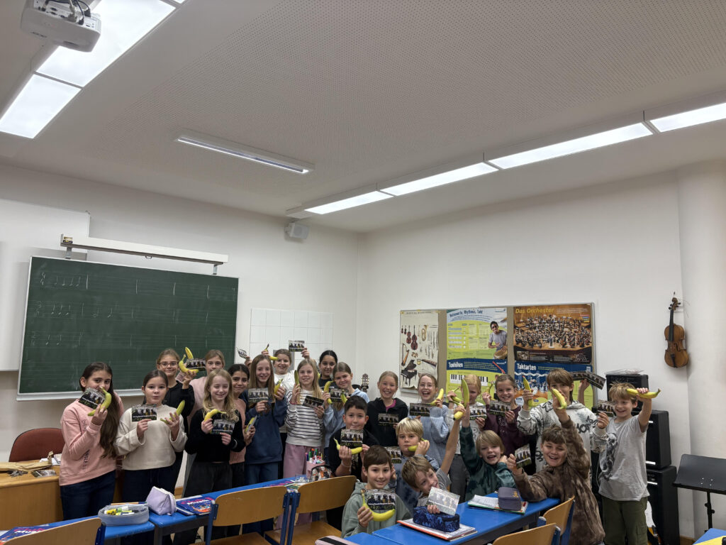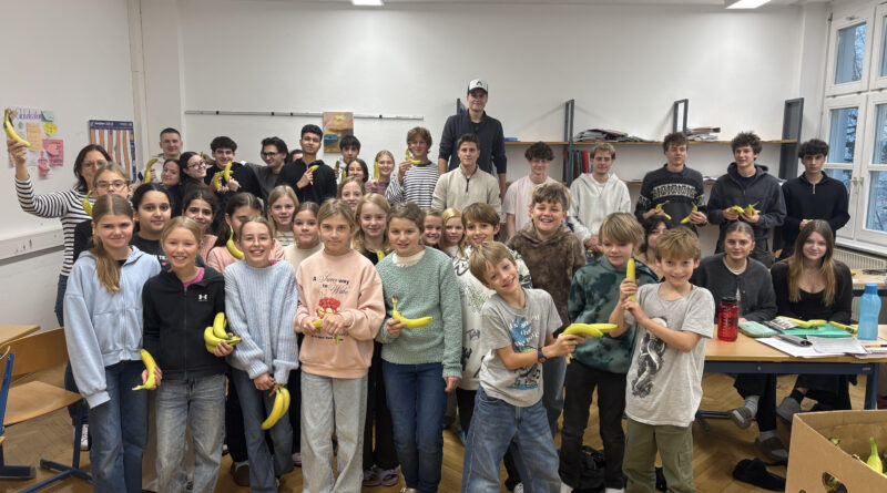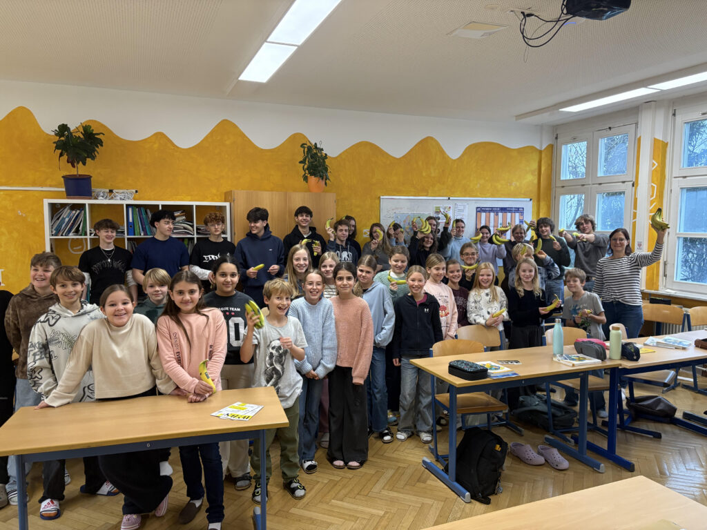 Deshalb verteilte die Klasse 1B des BG/BRG Hallein am Montag, den 14.11.2025 Bananen für die 8.Klassen. So möchten sich die Schüler:innen gemeinsam mit vielen Engagierten in Österreich für den fairen Handel einsetzen und möglichst viele Menschen dazu ermutigen, faire und nachhaltige Produkte zu verwenden.